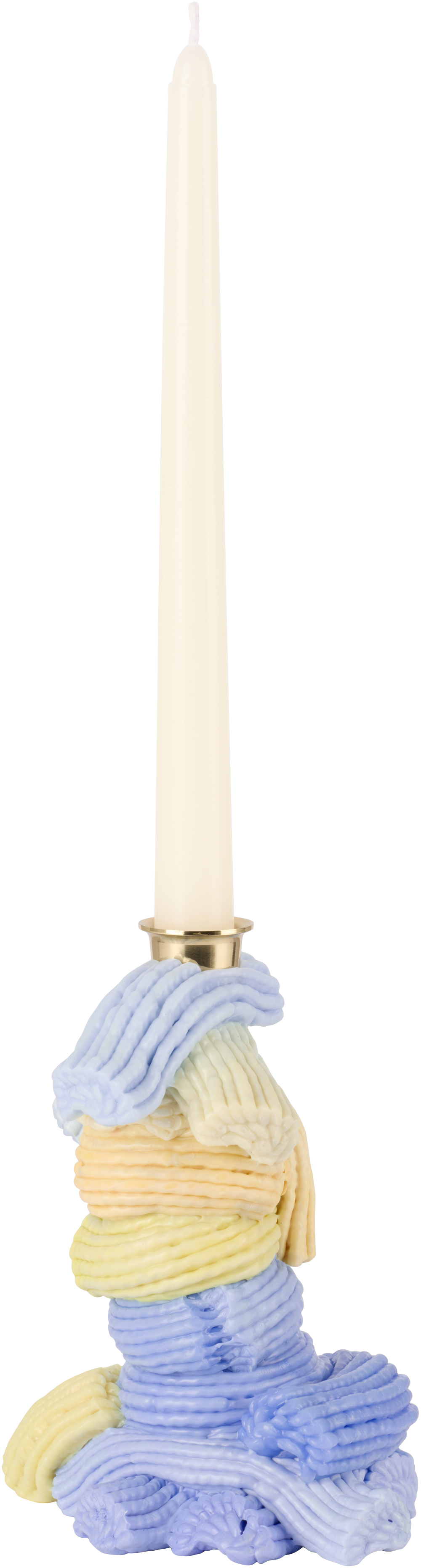 Recycled polymer candle holder in blue and yellow. · Textured detailing throughout · Brass candle cup · Logo embossed at base · Base: D120 mm · Height approx.: H100–H200 mm Each item is unique. Please note coloration and finishings may vary. Supplier color: Blue/Yellow