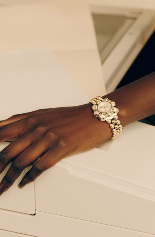 Clusters of gleaming ball beads in a variety of sizes blur the line between art and fashion with this Swiss-quartz timepiece boasting a minimalist mother-of-pearl dial and lines of brilliant four-pronged crystals. Measurements: 30mm case; 10mm case depth; 16mm band width.Strap/closure: Jewelry clasp closure.Movement: Swiss quartz movement. Quartz movement: powered by a battery and features an internal electrical circuit to control the rate of the watch's ticking.Other features: Mother-of-pearl dial. Stainless steel/crystal Swiss made
