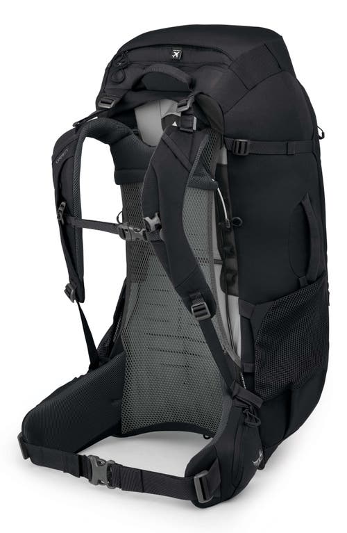 This high-capacity, high-utility backpack has a hybrid design so you can carry it like luggage when traveling through airports and reconfigure it to carry on your back while you're on the trail. The travel-ready design lets you pack it like a suitcase, while it also packs into its own protective bag for shipping as checked baggage.Closure: Zip-around front panel.Exterior features: Removable sleeping pad straps; upper-side and front-panel compression straps stabilize loads; zip top, vertical-front and hip-belt pockets; durable stretch-woven side pockets; padded tubular side grab handle; Daylite attachment loops/external attachment points; vertical front panel quick-zip pocket; 3D-tensioned breathable mesh back panel with side ventilation; soft, edgeless padded mesh harness with 4-plus inches of adjustability for perfect fit; adjustable sternum strap with magnetic bite valve attachment; breathable, stowaway reverse spacer mesh hipbelt; 4mm LightWire peripheral frame effectively transfers the load from harness to hipbelt.Interior features: Multifunction sleeve carries a hydration reservoir or tablet/laptop in padded case; dual internal compression straps with fabric wings keep clothes neat.Special features: Protective travel AirCover® doubles as a waterproof rain cover in stormy weather and stows away in a labeled exterior pocket when not in use. Webbing straps on the front panel of the pack come in handy when you need to bring an additional Farpoint/Fairview or Daylite pack, and the tensioned mesh backpanel keeps the weight off the back, enabling highly ventilated carrying comfort. Recycled nylon Imported CA WARNING: this item can expose you to dimethylformamide, a known carcinogen. See below link for more details on Proposition 65