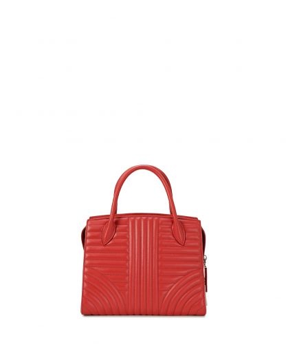 Red logo details handbag, top handle, logo logo, zipper opening and closing.