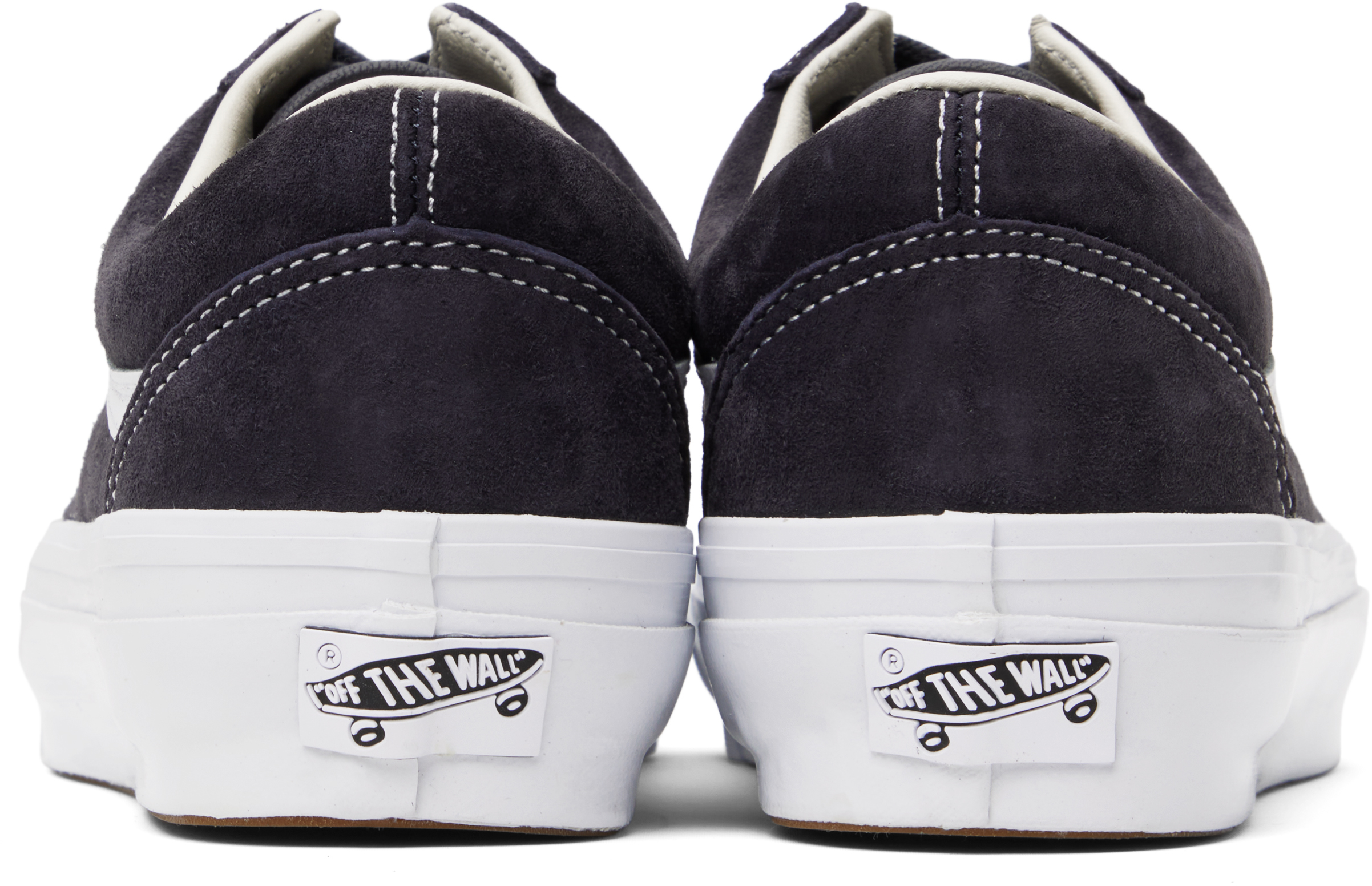Low-top pigskin suede sneakers in navy. · Lace-up closure · Padded tongue and collar · Grained leather Sidestripe™ at sides · Rubberized logo patch at heel · Grained leather and canvas lining · Removable padded foam insole · Treaded rubber sole · Contrast stitching in white Supplier color: Pig suede nine iron